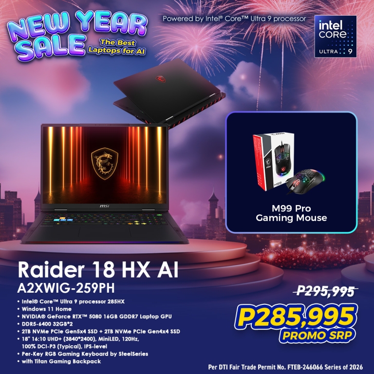 Its massive 18-inch display, premium build, and advanced cooling system make it ideal for high-resolution gaming, content creation, and AI-driven workflows — offering desktop-level power in a portable form factor. The MSI Raider 18 HX AI delivers extreme, flagship-level performance — available at P285,995 promo price with P10,000 discount.