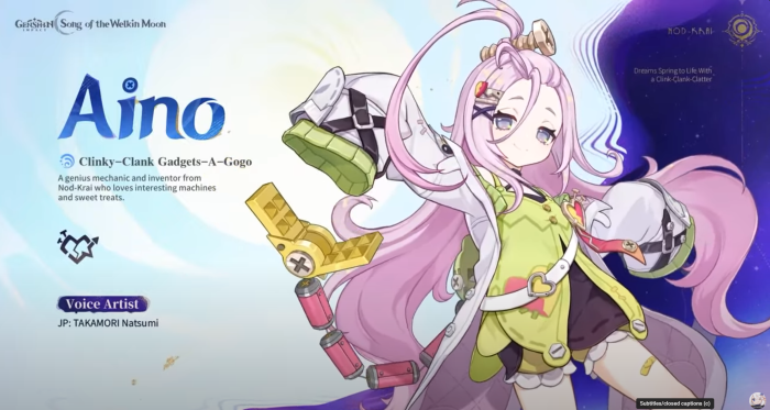 Aino, a four-star Hydro Claymore wielder and creator of Ineffa, brings both mechanical ingenuity and a touch of home. Her workshop and inventions, including the duck-shaped combat device “Knuckle Duckle,” add playful new interactions to the adventure. Players can recruit Aino to their party for free by progressing through the new Archon Quests in Nod-Krai.