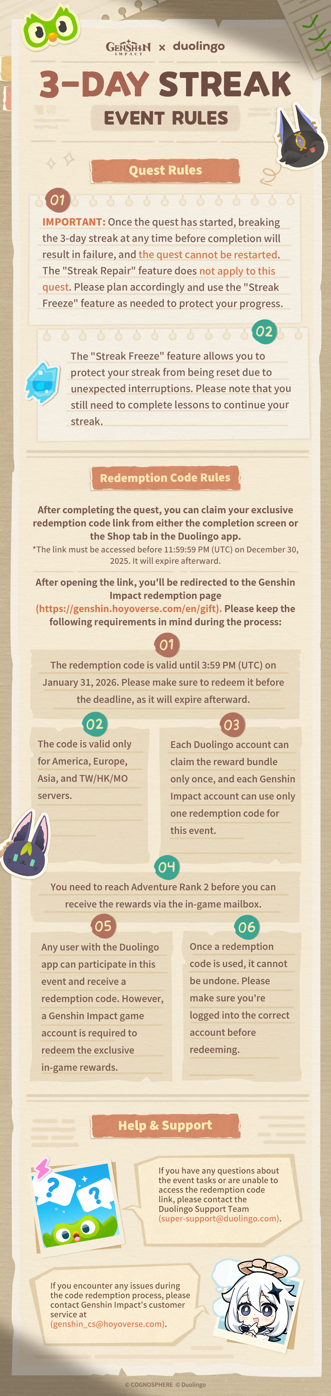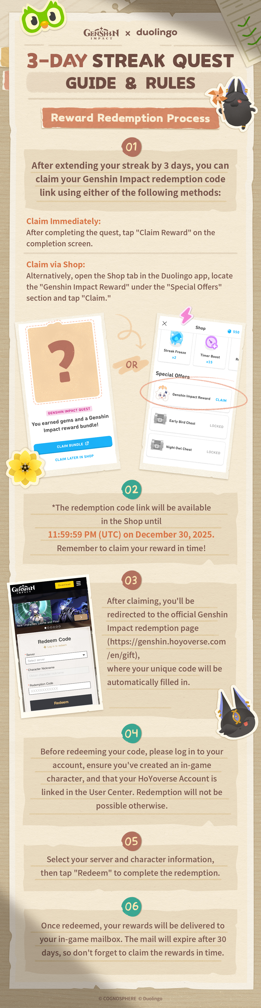 The “Genshin Impact x Duolingo 3-Day Streak Quest” will be available in select regions from December 8 to December 27. December 25 is the last day for learners to join the Quest and earn rewards. Event availability varies by region. Learners can check participation details for their region in the Duolingo app. For more details, please visit https://www.duolingo.com/help/genshin-impact.