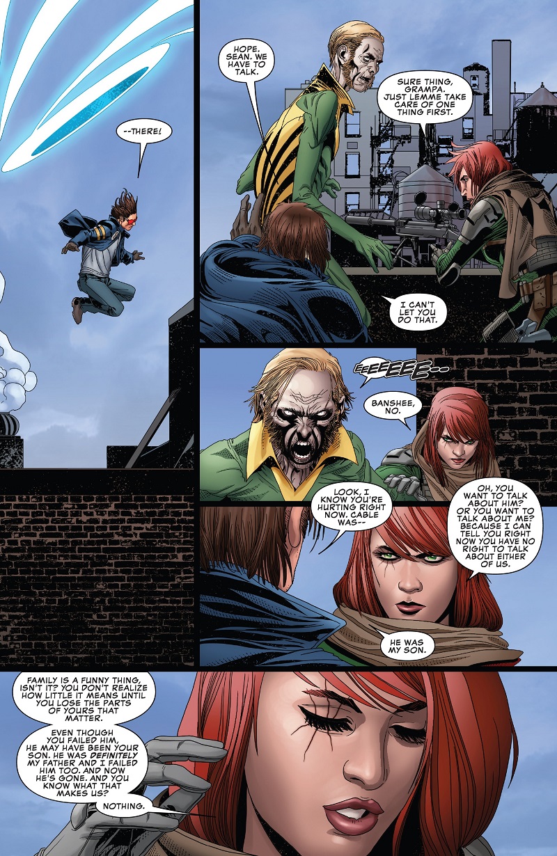 While the rest of the team fight the other mutants, Cyclops has Magik teleport him to the location of Banshee and his “granddaughter” Hope Summers.
